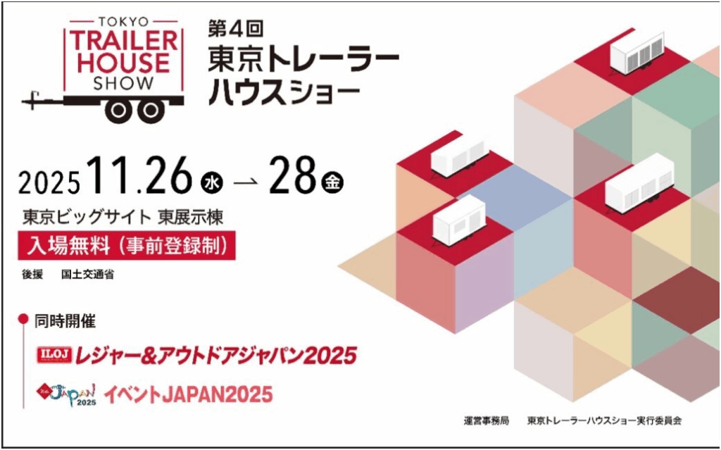本イベントは今年、国土交通省の後援を受けて開催され、トレーラーハウス-の最新トレンドや活用方法を紹介する各種セミナーのほか、多様な用途で活用される実物のトレーラーハウスが多数展示されます。